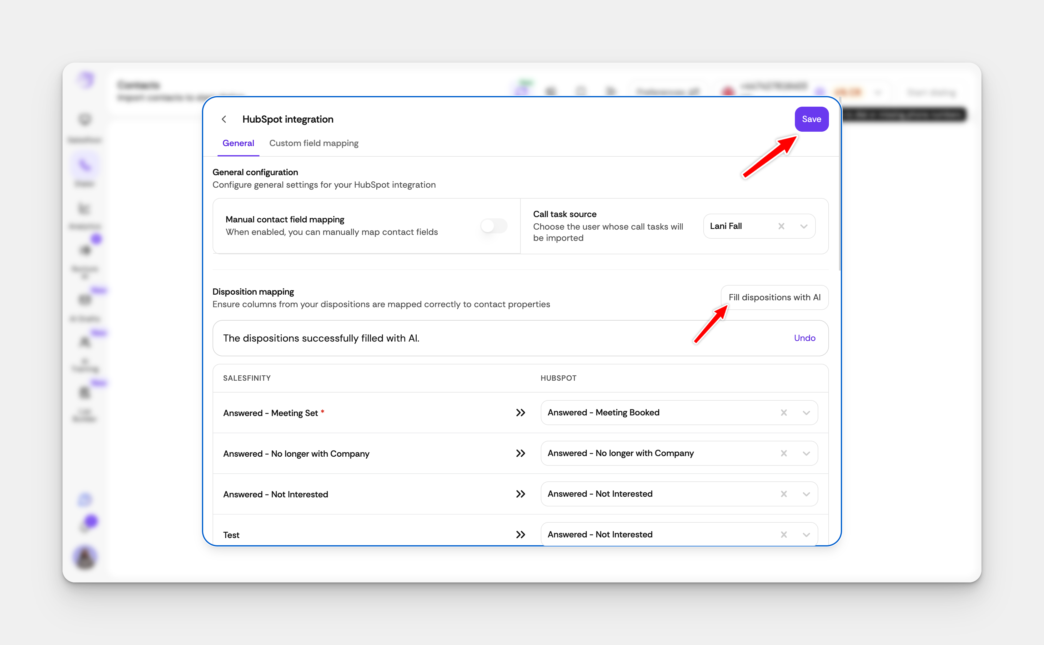 Next select Fill Dispositions with AI and select Save (Note: Make sure disposition mapping is the same for all users)