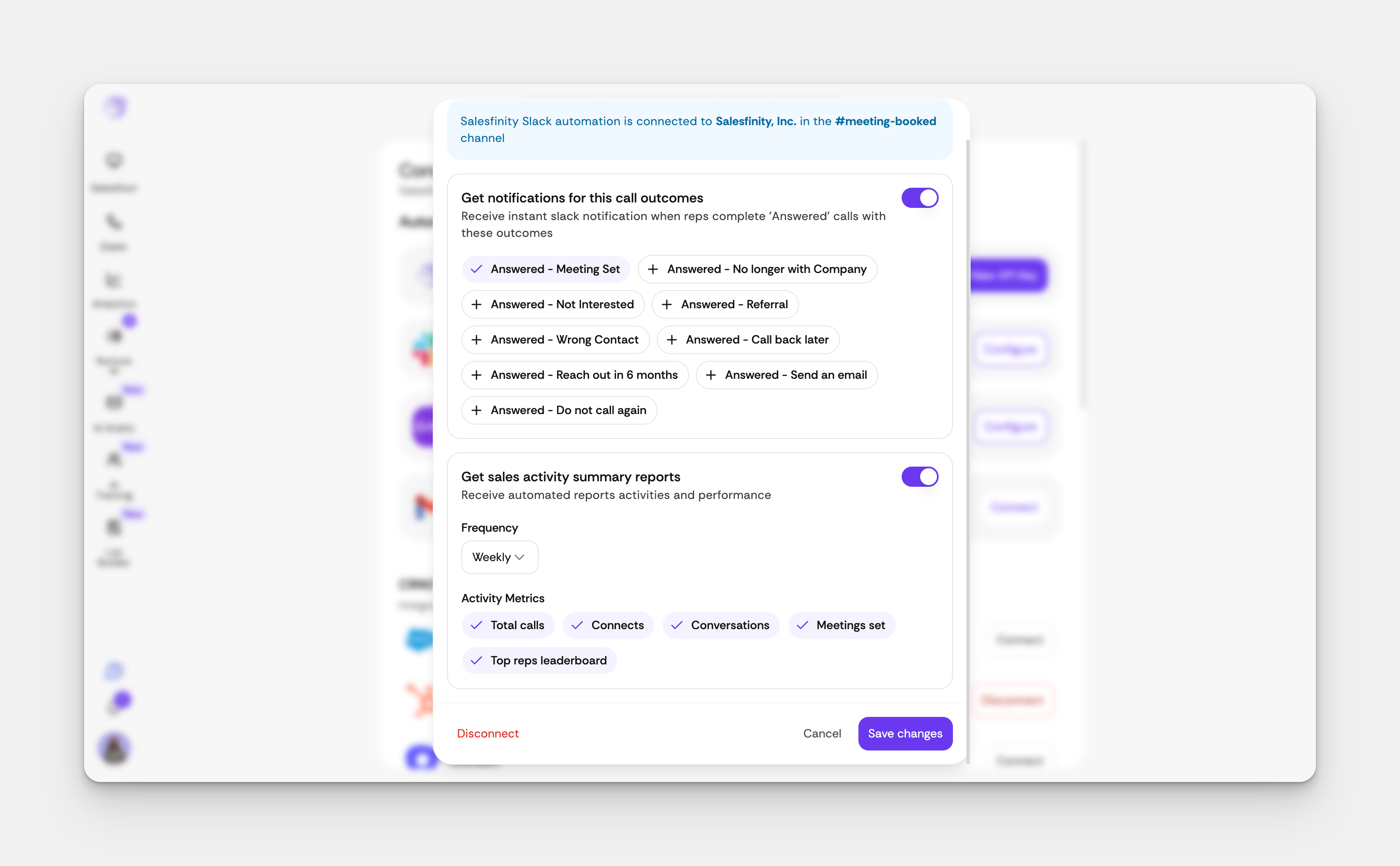 Once connected, toggle the call dispositions you'd like to push into Slack